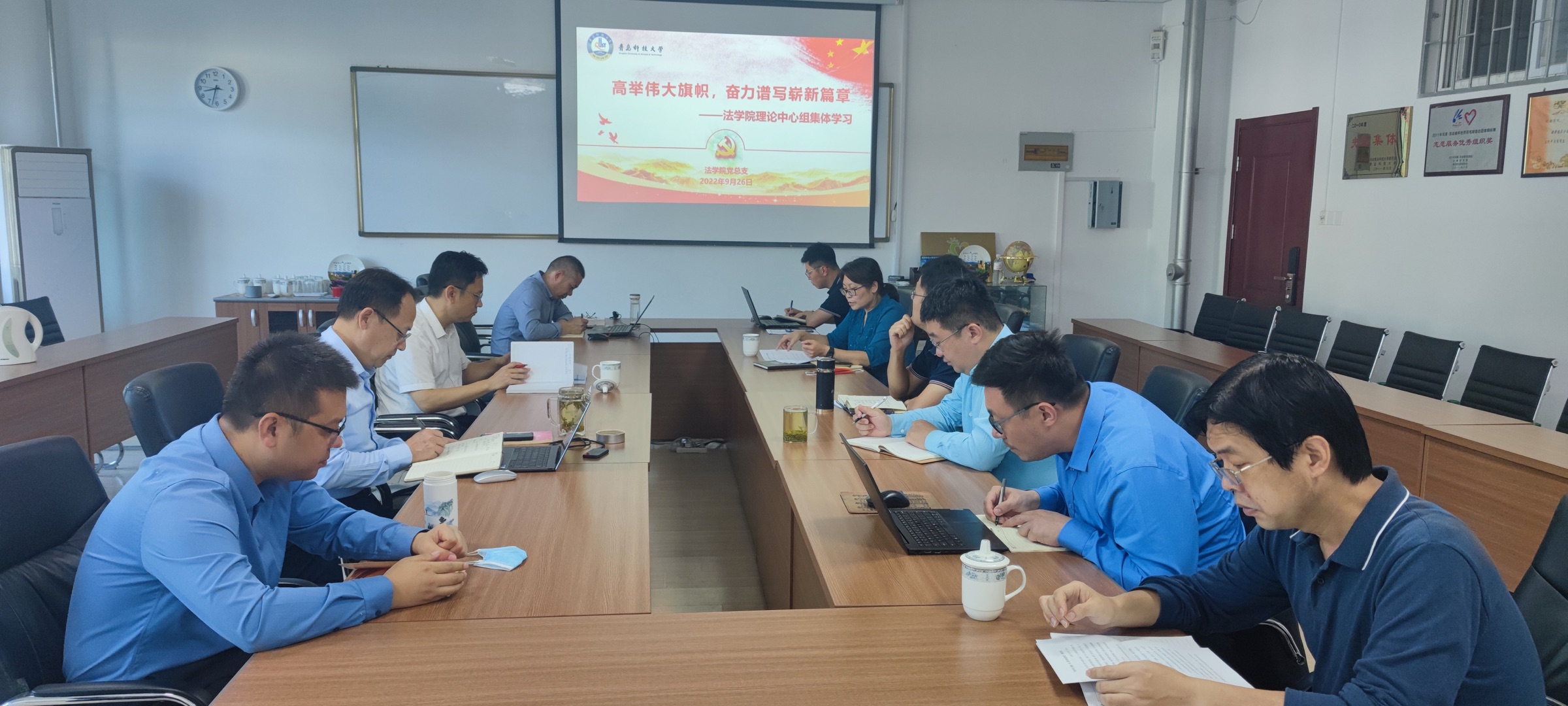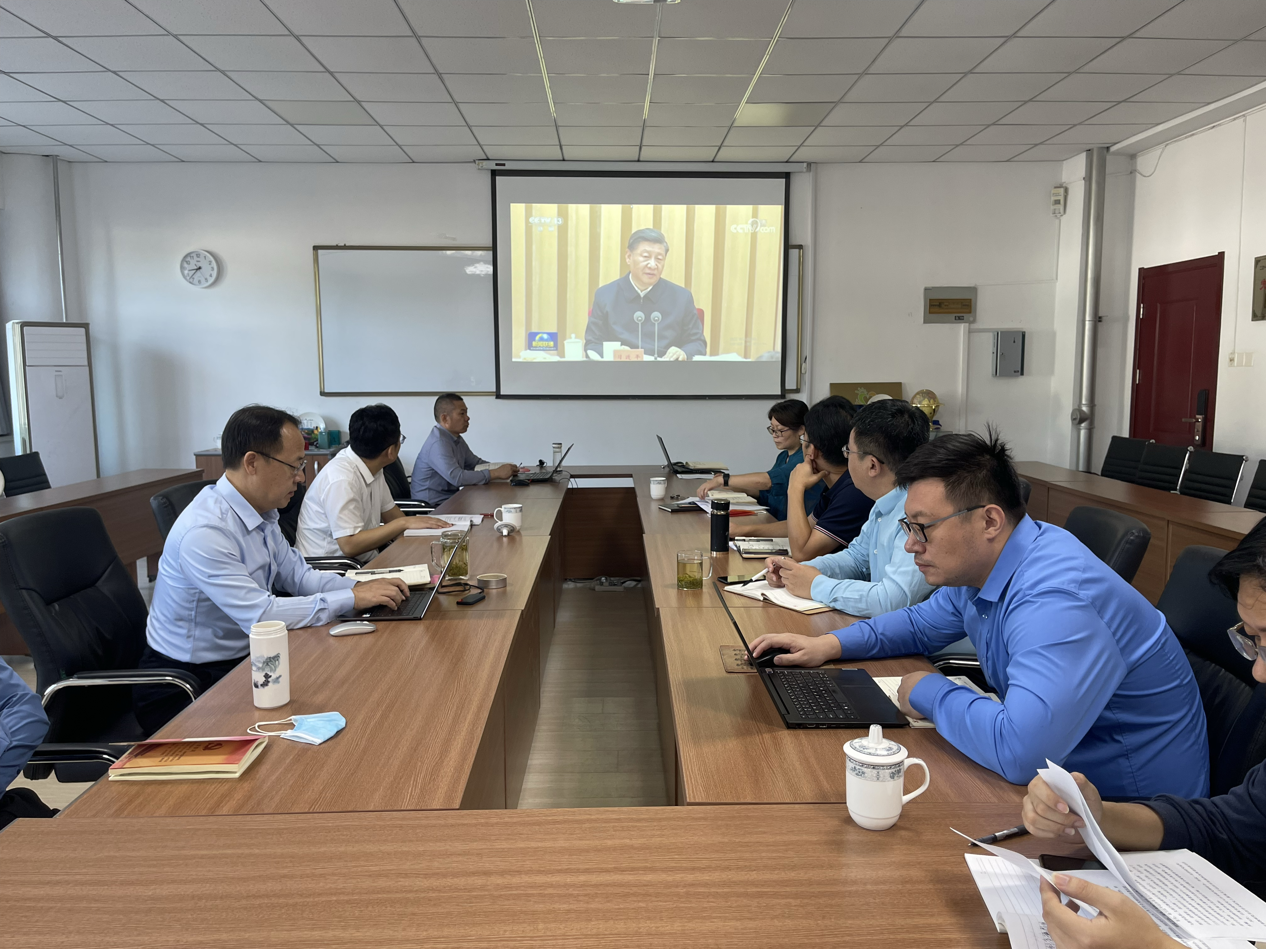 与会人员观看了新闻联播视频《习近平在省部级主要领导干部“学习习近平总书记重要讲话精神,迎接党的二十大”专题研讨班上发表重要讲话强调高举中国特色社会主义伟大旗帜,奋力谱写全面建设社会主义现代化国家崭新篇章》。李卉带领大家原文学习了《全党必须完整、准确、全面贯彻新发展理念》,王卫国领学了《关于认真学习宣传贯彻<习近平谈治国理政>第四卷的工作方案》。