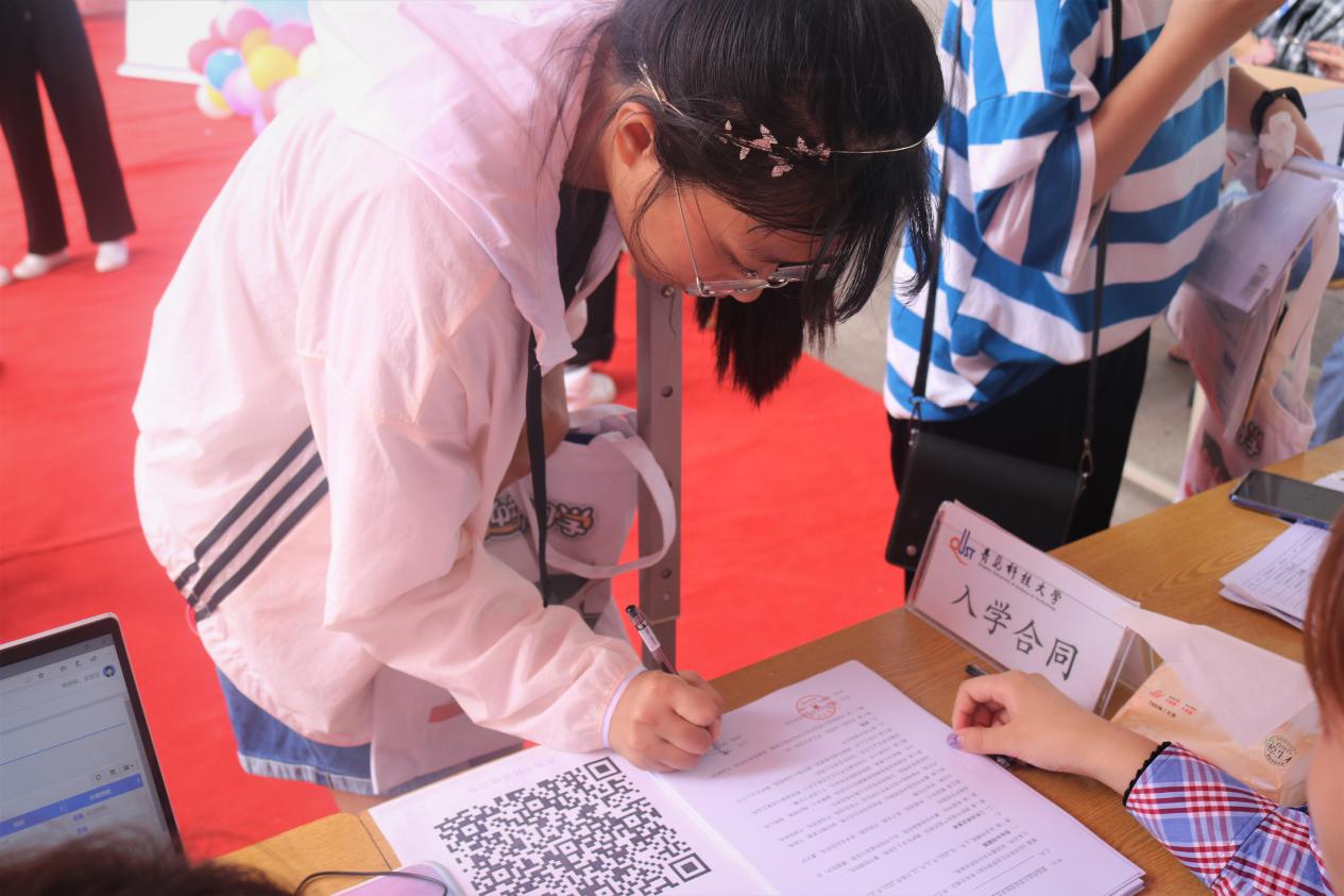 “甲方:公司员工会;乙方:新同学。为使乙方能够在大学期间成为一个有理想、有本领、有担当的优秀人才,双方在平等自愿的基础上,同意签订本合同。”公司员工会为2020级新生量身订制了一份别出心裁的“新生入学合同”,让新同学对自己专业有一个初步了解的同时,也助力员工提升规矩规则意识,培养公司员工契约精神,增强同学们的职业认同感。报到点设立“大学堂开,法律门启”的合影墙和考研风云榜,以司法考试、考研考公、社工师的榜样事例,让新生提前感受进入法律之门的使命和担当,巩固专业认同教育。