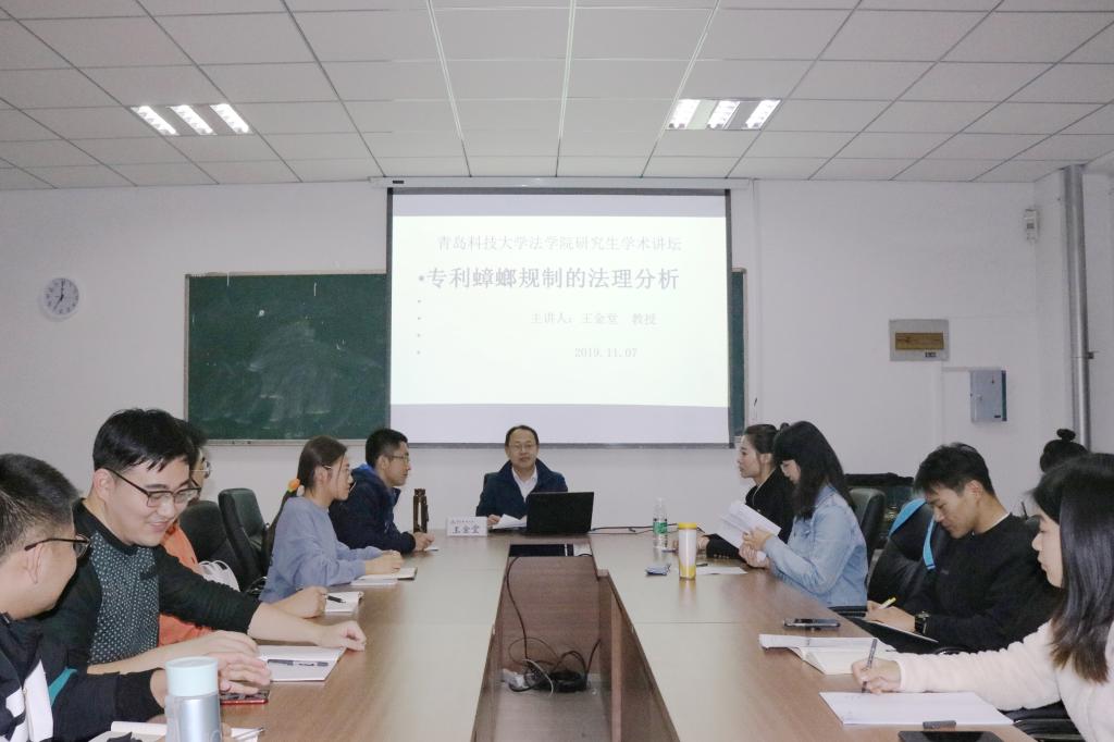 王金堂教授从专利蟑螂的界定及其原因分析、专利蟑螂的价值分析、专利蟑螂规制的法理基础、专利蟑螂规制的路径选择等四个方面阐述了其独到见解,并围绕“我们的选择”这一话题与同学们进行了交流互动。