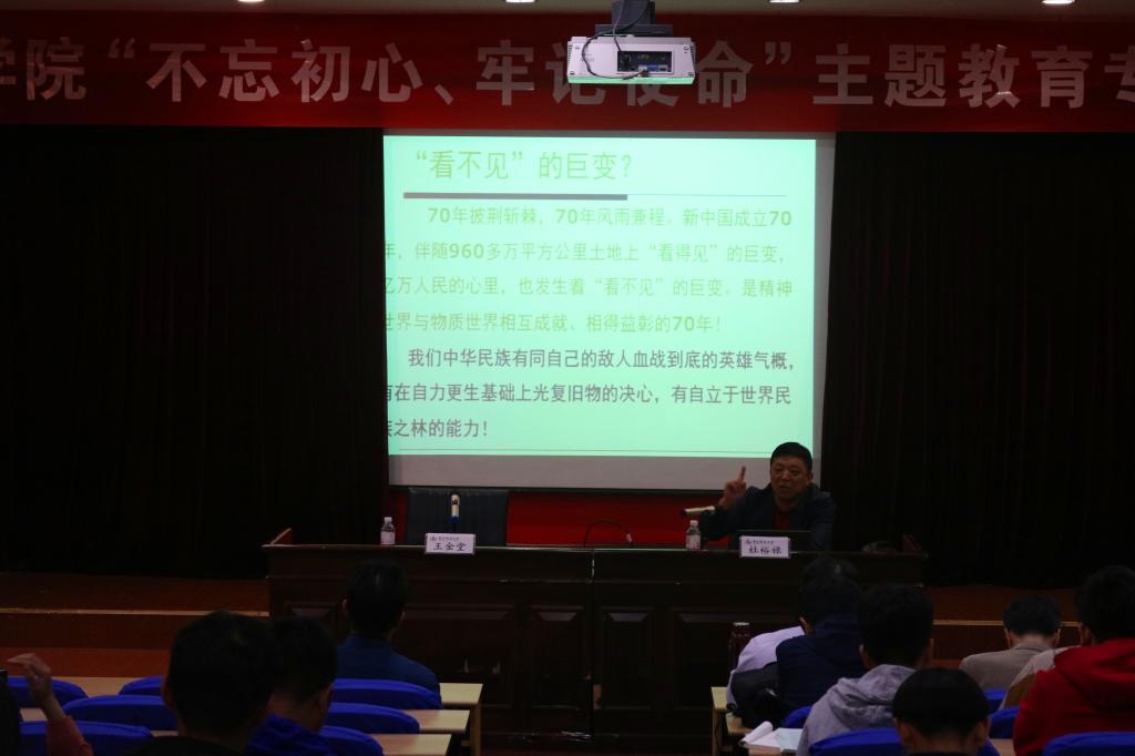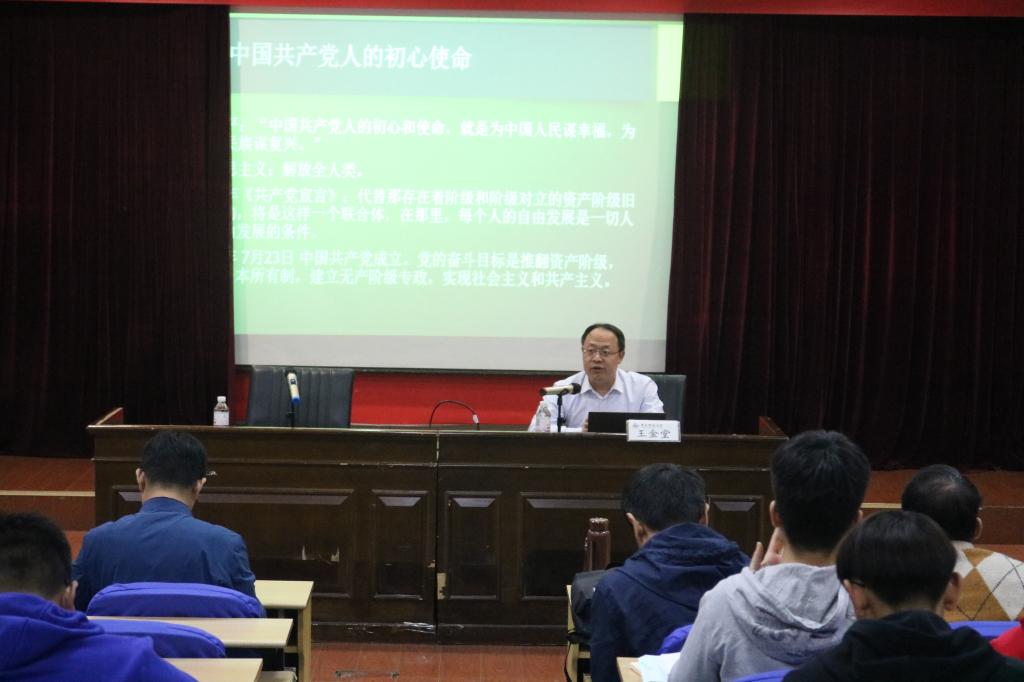 王金堂以《牢记初心使命,坚定道路自信,做中华民族伟大复兴事业的实干家》为题开展专题党课。王金堂从马克思主义的产生到马克思主义中国化的进程讲起,诠释了中国共产党人的初心和使命,就是为中国人民谋幸福,为中华民族谋复兴。王金堂从中国共产党的理论先进性和传承性等方面讲解了中国共产党领导的理论优势,从发展策略的系统性和党内组织的执行力等方面讲解了中国共产党领导的实践优势。最后,王金堂要求广大师生党员自觉以习近平新时代中国特色社会主义思想为指导,立足岗位做好教书育人和团队建设工作,亮明身份发挥先锋模范带头作用,争做做中华民族伟大复兴事业的实干家。