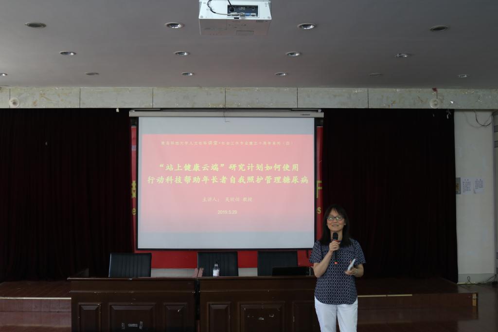 第二场讲座,美国南加州大学社会工作公司吴欣怡教授带来《站上健康云端研究计划——如何使用行动科技帮助年长者自我照护管理糖尿病》的专题讲座。首先,吴教授简要讲解了糖尿病的病理知识与对人体所造成的不良影响,并用数据展示了目前糖尿病患者在中国以及美国的数量情况,强调了该研究的紧迫性。接着,吴欣怡教授用详细的数据,详细介绍了该项目的志工招募,项目的运作,研究的开展,服务效果的评估等各项环节的情况。指出:目前以平板电脑为代表的移动科技的使用可以有效缓解老年人的糖尿病、高血压等慢性病症状,并且老员工与老年人在移动科技使用上的交流与互动,将有效缓解世代隔阂,促进老年友好型社会、健康型社会建设。
