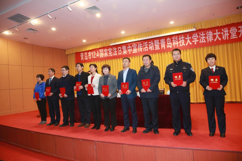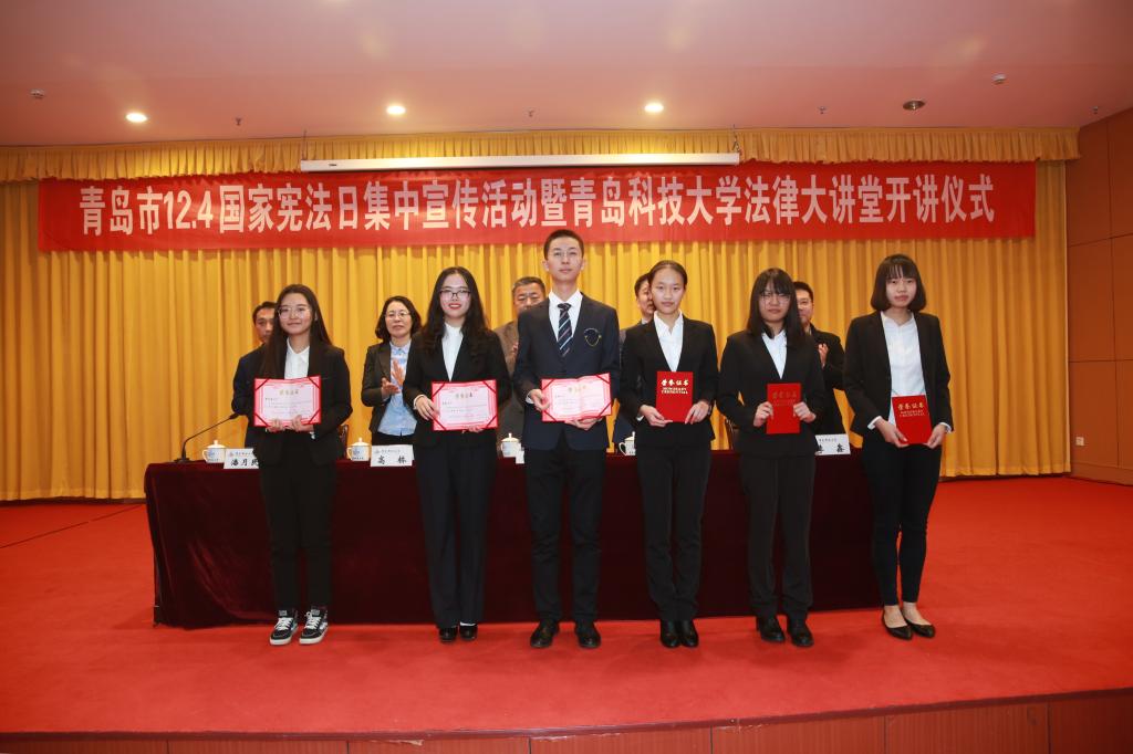 会上为包括公司宋敏、綦磊、张亮老师在内的青岛市“普法讲师团”讲师颁发了聘书,为近期公司开展的征文比赛、演讲比赛等国家宪法日系列活动的获奖同学颁发了证书。