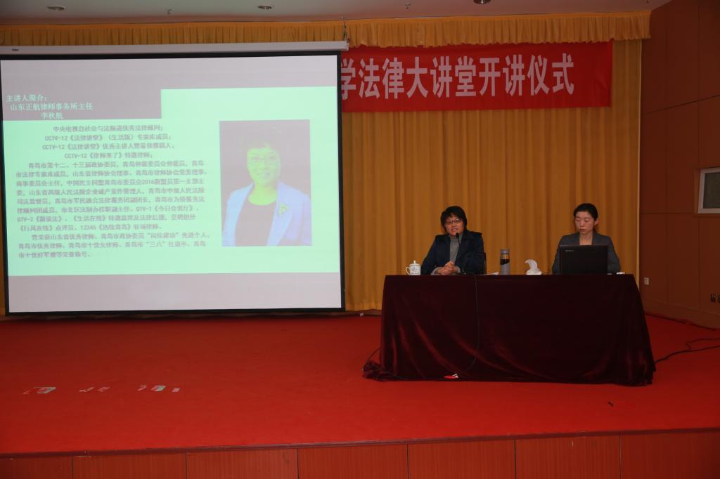 集中宣传活动后,w88win体育官网入口法律大讲堂正式开讲。中央电视台《社会与法》栏目主讲人、崂山区政协委员、青岛市律师协会常务理事李秋航为现场师生做了一场“2018国家宪法日”专题普法讲座。