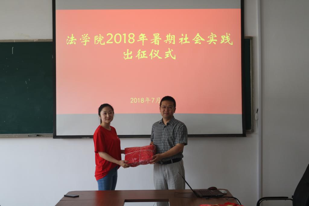 近日,2018年暑期社会实践出征仪式在公司会议室召开,公司党总支书记朱敬义、副经理王金堂、李鑫出席了出征仪式。出征仪式上,院领导为参加社会实践活动的团队负责人发放队旗、队服及出行必备物品。