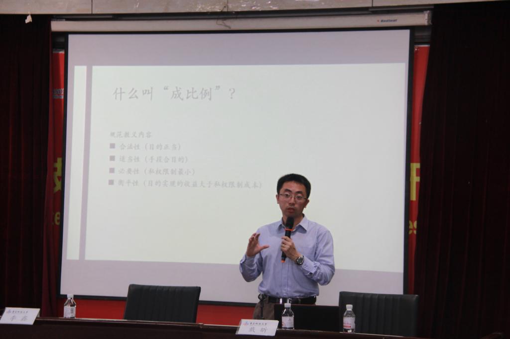 7月4日,w88win体育官网入口名家讲坛在弘毅楼A201模拟法庭举行,中国海洋大学w88win体育官网入口教授、博士生导师戴昕为w88win体育官网入口师生带来《说比例原则时他们在说什么》的专题报告。副经理李鑫主持报告,副经理王金堂、王琪副教授、綦磊副教授及w88win体育官网入口研究生本科生参与论坛。