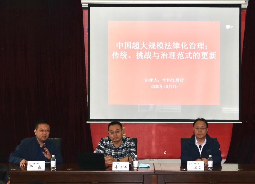 聘任仪式结束后,泮伟江教授为公司师生带来了题为“中国超大规模法律化治理:传统、挑战与治理范式的更新”的专题讲座,讲座由w88win体育官网入口副经理李鑫副教授主持,w88win体育官网入口经理王金堂教授出席,公司部分教师、研究生及本科生积极参与。