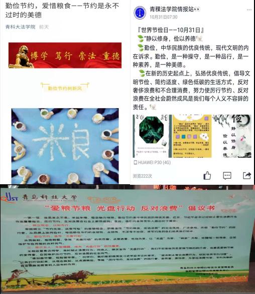 (一)开展“制止餐饮浪费”宣传活动。公司利用微信公众号、QQ空间、公司网站等媒介平台,广泛展示厉行勤俭节约的重要意义及我国历史上关于勤俭节约的优秀案例,让同学们深刻地认识到了我国以及世界的目前粮食生产所面临的挑战和困难。