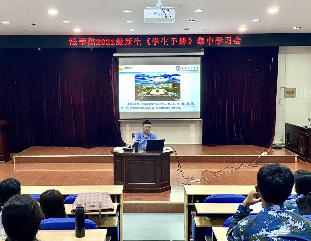 为进一步强化新生的规矩意识,做到知校规、守纪律,9月14日晚,w88win体育官网入口在弘毅楼模拟法庭召开2021级新生入学教育暨《员工手册》集中学习会。w88win体育官网入口学工办主任兼团委书记付继航出席会议并作重要分享,全体新生参加此次会议。