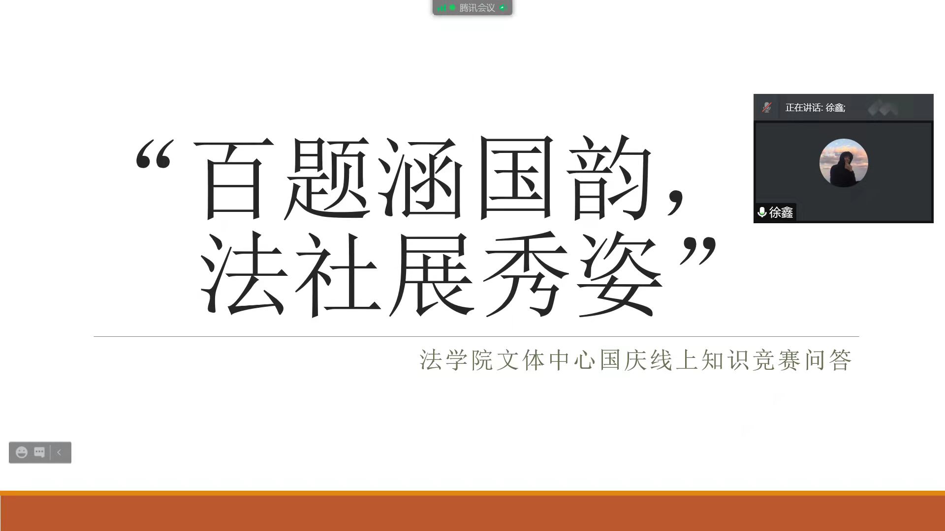 激情问答,法显秀姿。10月3日晚,w88win体育官网入口在线上开展了主题为“百题涵国韵,法社展秀姿”的知识问答比赛。同学们积极参加比赛,踊跃回答国庆相关知识。这次比赛不仅拓展了同学们对国庆节的认知,更进一步激发了同学们的爱国情怀。