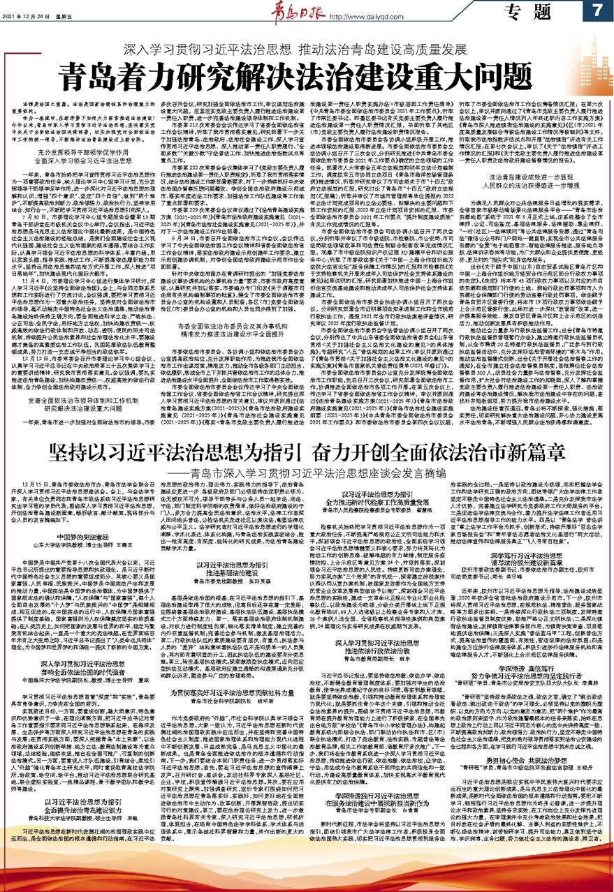 宋敏从坚持党对全面依法治国、依法治市的领导,习近平法治思想具有鲜明的实践性和实践伟力,以及习近平法治思想是推进国家治理体系和治理能力现代化的法治指南三个层面深入阐释了习近平法治思想的理论脉络,结合青岛法治建设的实际提出了全面依法治市的针对性建议。山东大学、中国海洋大学、市委党校、市科院的专家也分别进行了交流。