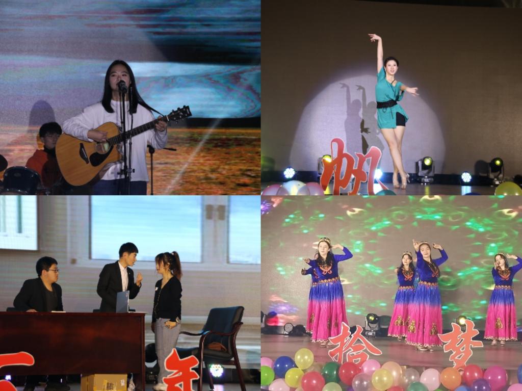 袭袭红裙,翩翩飞舞,晚会在开场舞中拉开帷幕。第一篇章“青春·拾梦芳华”,积雨云乐队率先带来了《平凡之路》和《Pieces》两首歌曲,以跳动的音符感染着在场的每一个人;杨景欣、谭小檀、王润滋带来的舞蹈串烧《Dump Dump+River+Jealousy》活力四射、激情洋溢;小品《一切都是最好的安排》,在笑声中蕴含深意,启示同学们要坚信一切都是最好的安排。民族舞《有那么一个地方》用轻盈的舞步、甜美的笑容,展示了少数民族的独有特色;歌曲串烧节目则用动听的歌声表达了同学们对音乐的热情。