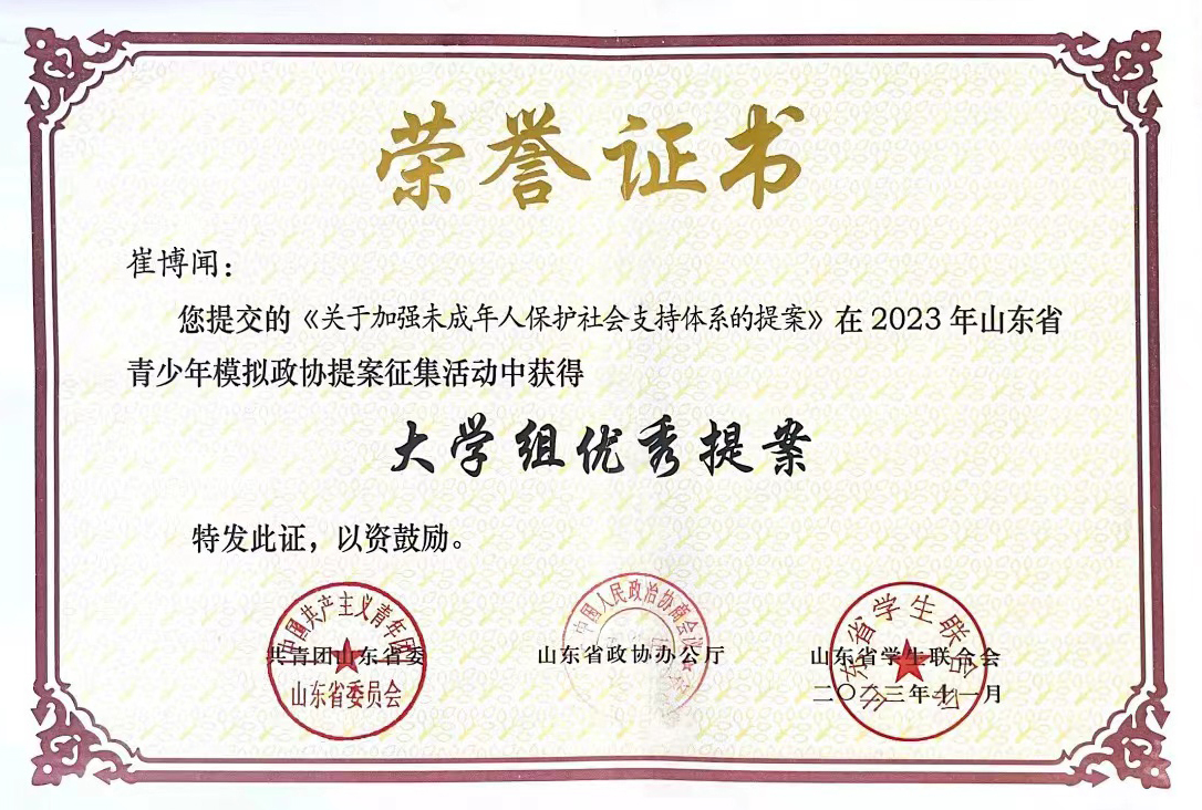近日,由共青团山东省委、山东省政协办公厅、山东省学联联合举办的2023年山东省青少年模拟政协提案征集活动落下帷幕。w88win体育官网入口法学223班员工崔博闻的个人提案《关于加强未成年人保护社会支持体系的提案》获评大学组“优秀模拟提案”(全校唯一)。