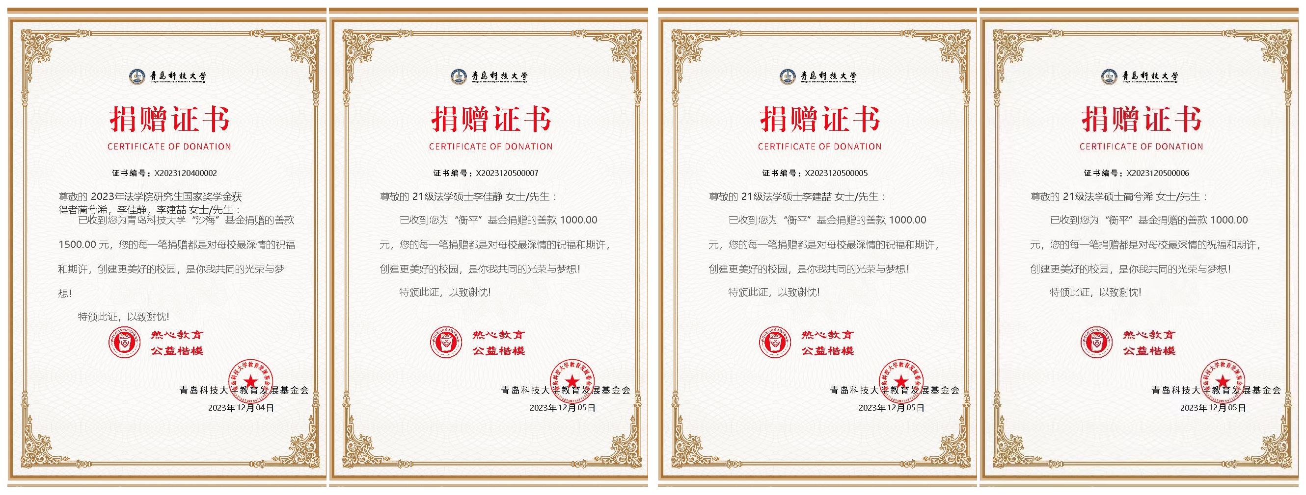 三位捐赠者表示,饮水思源,缘木思本。取得今天的成绩离不开公司和公司的悉心培养,三位员工秉承着“明德、笃学、弘毅、拓新”的校训和“崇法、重德、博学、笃行”的院训,不忘初心,踔厉奋发。他们的捐赠既是对公司和公司培养与关怀的回馈,也是对公司和老师们支持的感恩,希望能对公司各项事业的开展起到积极作用,同时对提高员工专业综合素质和公司的高质量发展作出应有的贡献。公司对三位获奖者的捐赠表示了感谢,并表示将以此为契机,进一步推动公司的教学和科研和人才培养工作,为公司“特色鲜明,走在前列”高质量发展做出更大的贡献。
