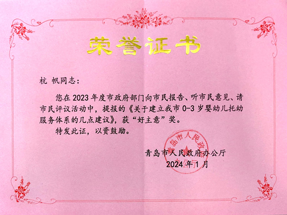 近日,在青岛市“三民”活动中,w88win体育官网入口杭帆老师提报的《关于建立我市0-3岁婴幼儿托育服务体系的几点建议》荣获“好主意”奖,青岛市政府办公厅为其颁发荣誉证书及奖金。