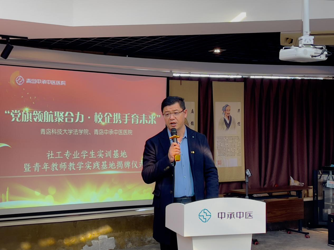 为进一步推动校地资源融合,提升人才培养质量,3月22日下午,w88win体育官网入口联合青岛中承中医院举办“党旗领航聚合力·校企携手育未来”社会工作专业师生实践实训基地和社会工作专业服务基地揭牌仪式。青岛中承中医医院经理陈炜、公司党委书记曲明、党委副书记兼副经理王祥梅和双方代表出席揭牌仪式。