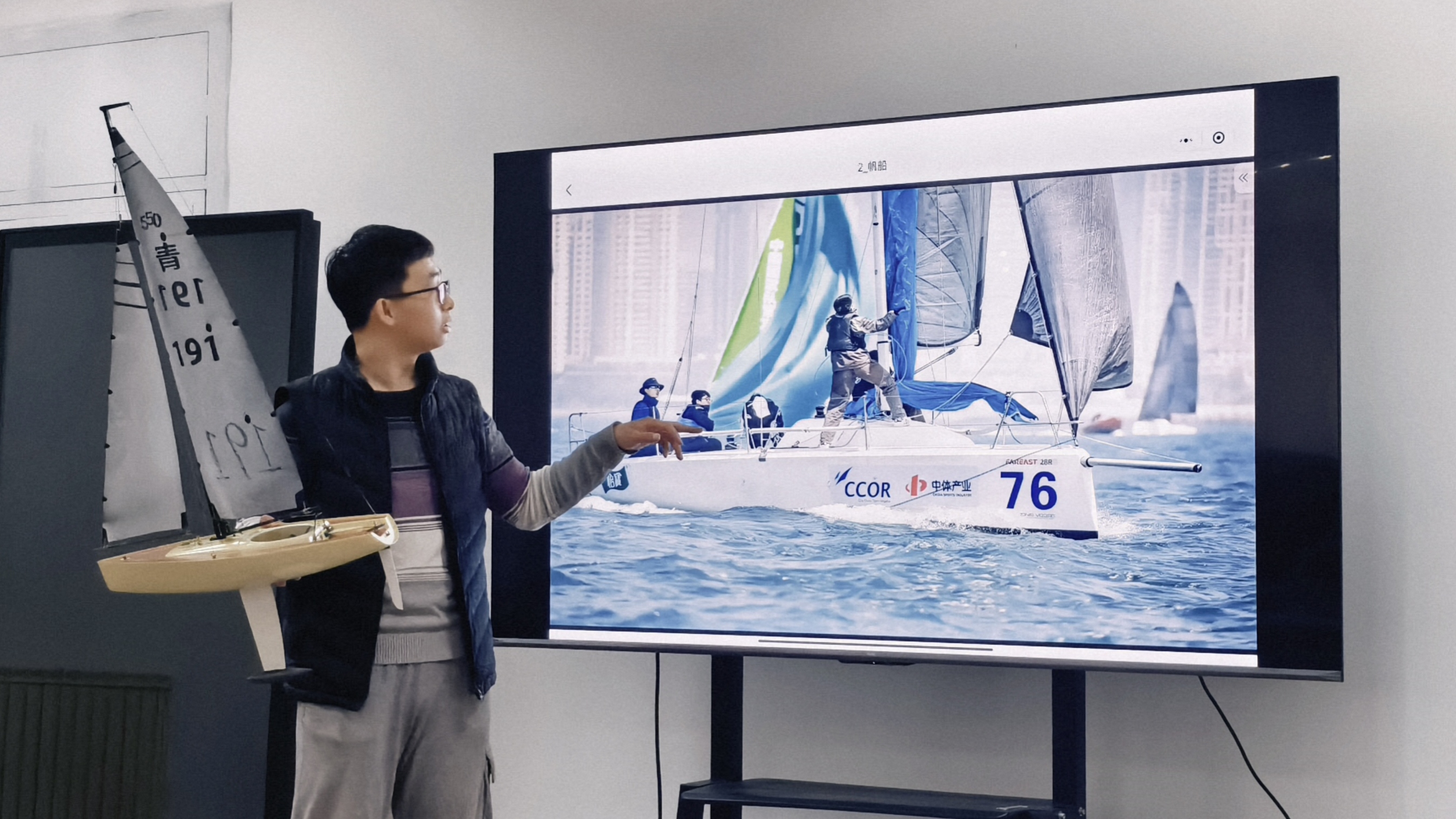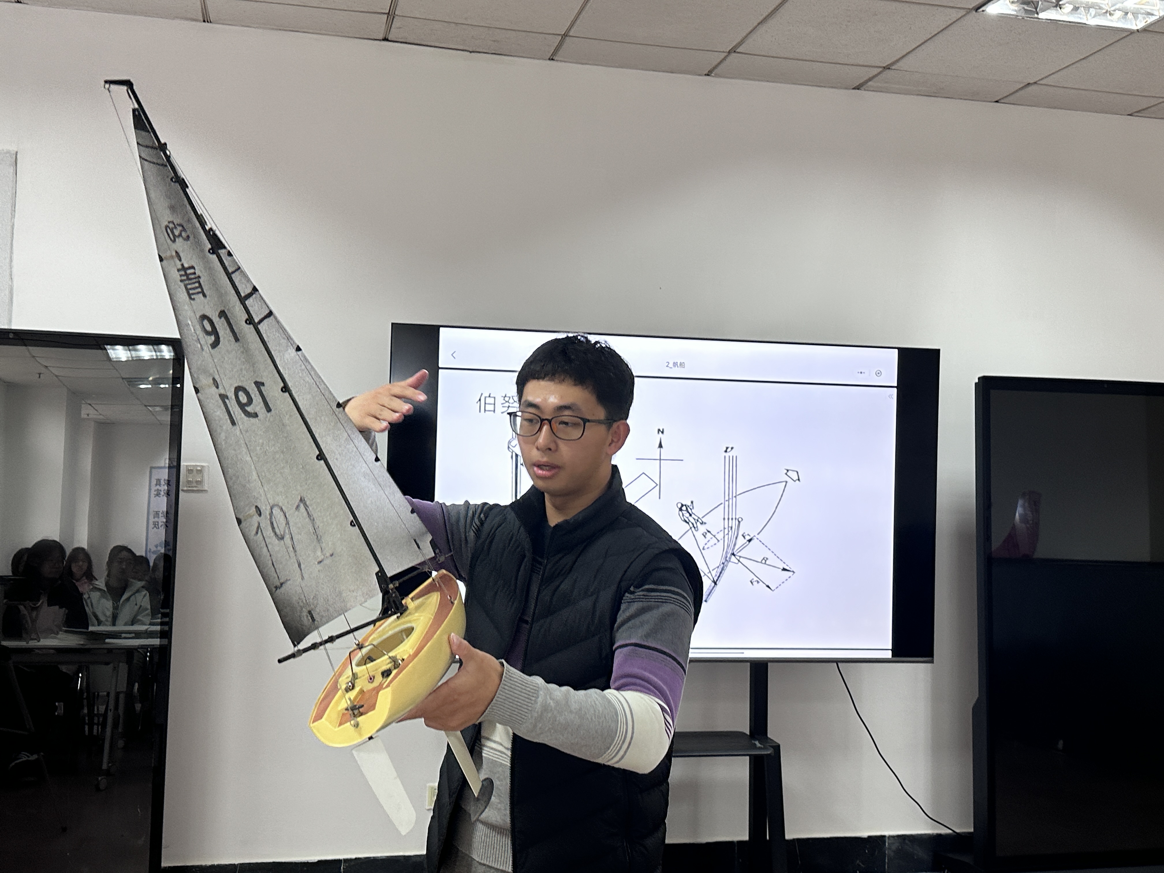 自大学入学以来,陈锦庚从帆船小白一路成长,从加入帆船俱乐部参加专业培训,到加入帆船队代表公司参加各类比赛,并作为校帆船队的一员在2023年中国老员工帆船联赛总决赛夺冠。从懵懂到专业,陈锦庚从自身经历出发,将帆船运动的历史发展、航行原理、竞赛规则等内容娓娓道来,为同学们揭开了帆船世界的神秘面纱。他说到,帆船运动不仅是一项体育竞技活动,更是一种人与自然和谐共处的生活方式。通过控制风帆,利用自然风力前行,增强了个人的航海技能,锻炼了个人意志力和团队合作精神。帆船运动展现了人类面对自然时顽强抗争、永不服输的精神,对于当代老员工的身体素质教育和精神磨炼起到了非常重要的作用。