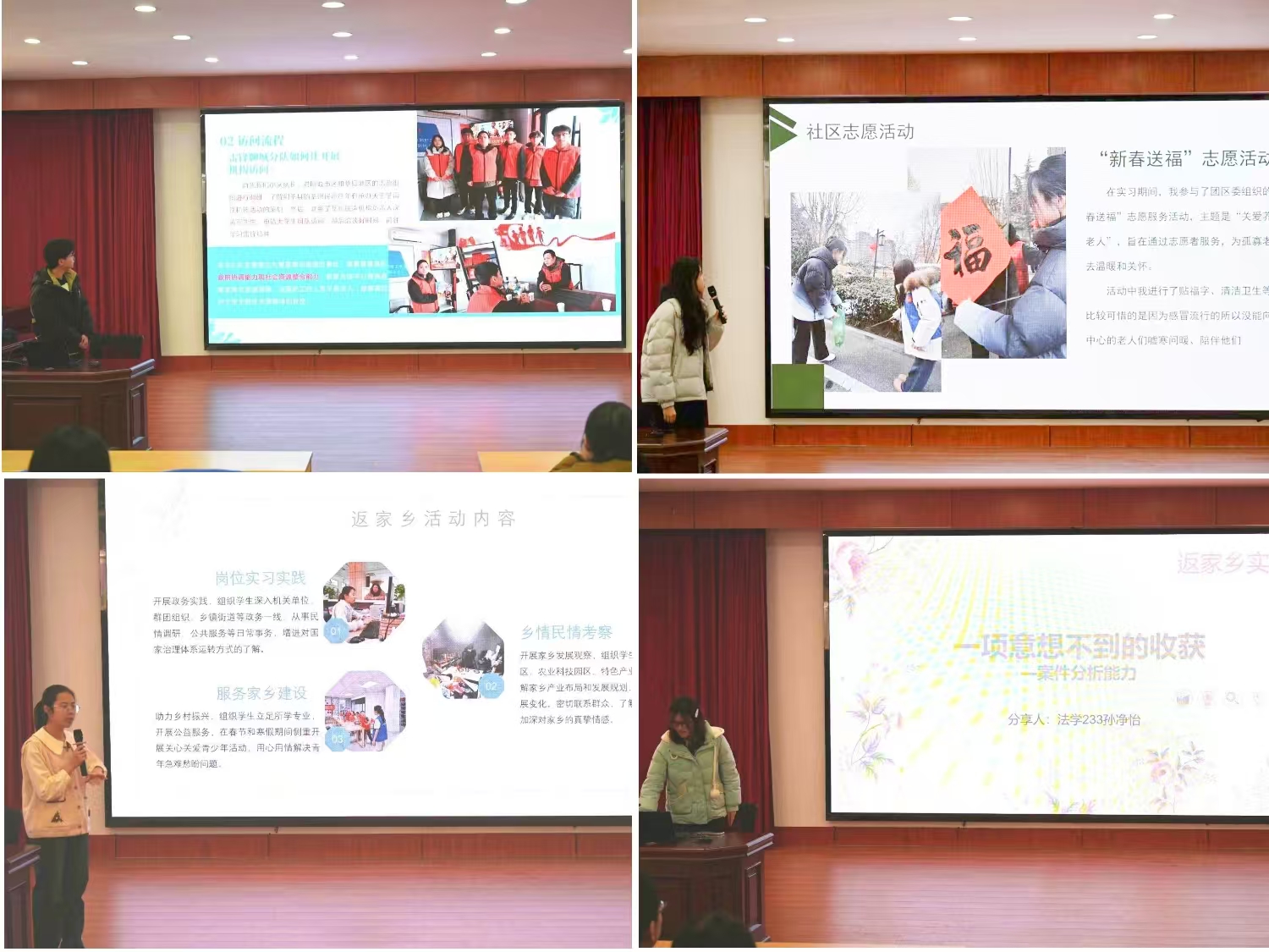 各实践团队从实践背景、实践内容、实践过程等多个方面,采取PPT、视频等方式展开分享。同学们通过生动的案例、翔实的数据和深刻的感悟,展示了他们在实践过程中的所见、所思、所感。在本次社会实践中,w88win体育官网入口青年员工将专业知识与社会实践深度结合,聚焦乡村振兴、基层服务、法律宣传等重点领域,充分发挥自身专业优势,积极开展法律知识普及、社会调研、法院实习等一系列丰富且扎实的实践活动。