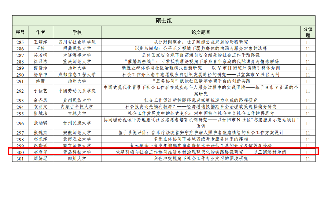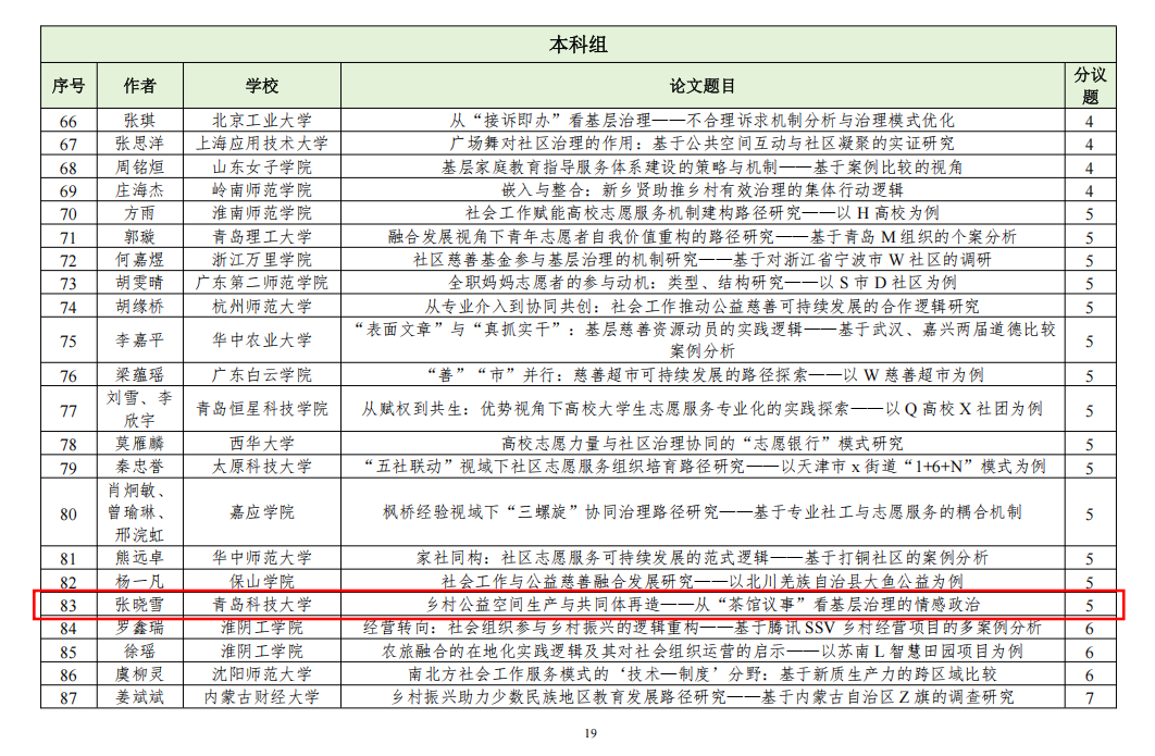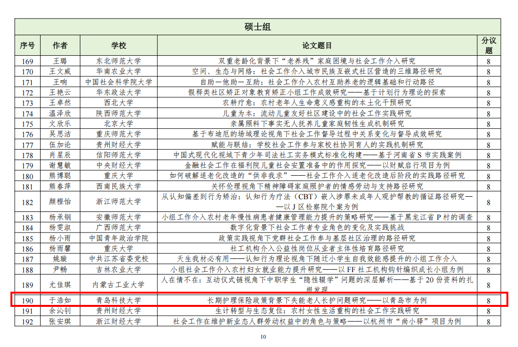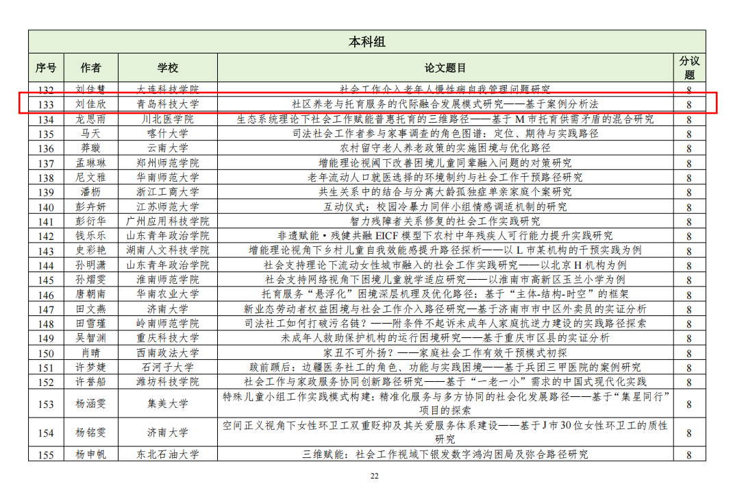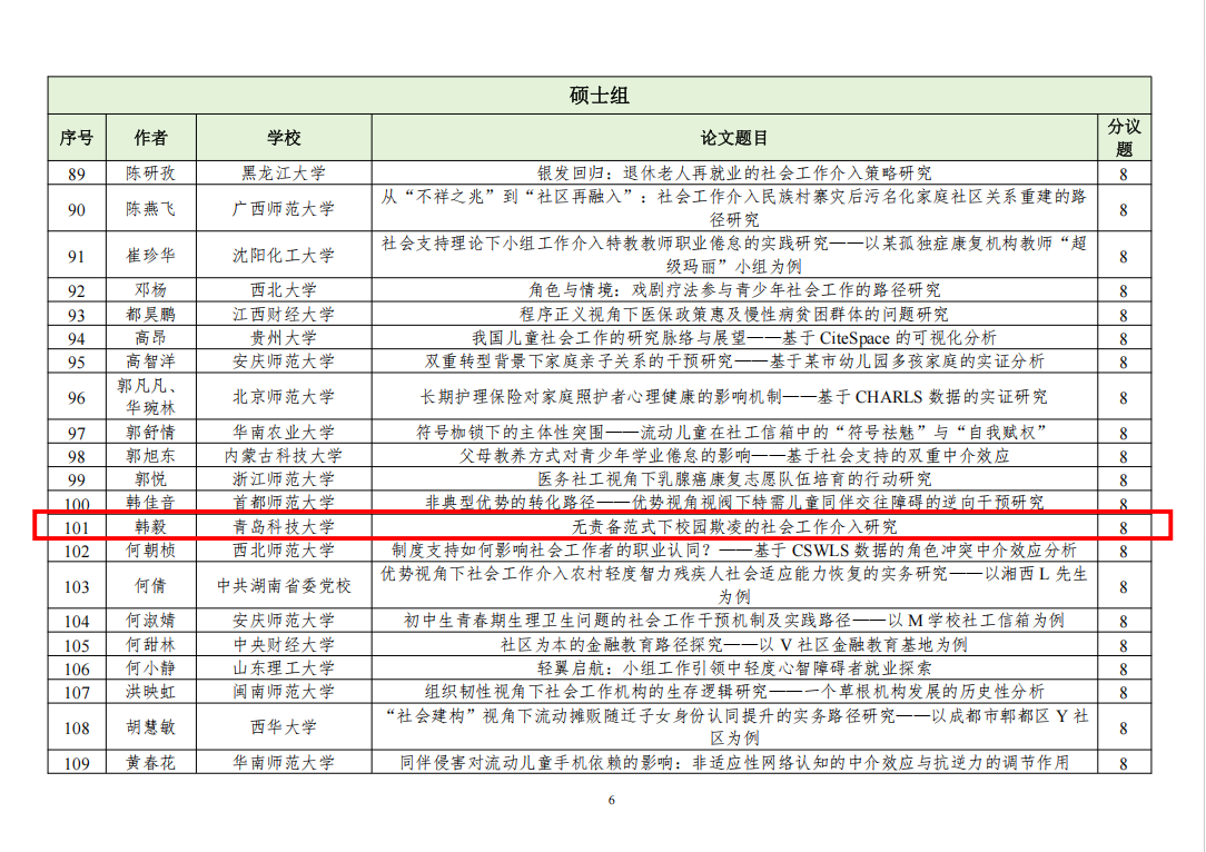 近日,中国社会工作教育协会发布“第十七届中国社会工作老员工论坛暨第十届社会工作研究生论坛”入选通知及名单,自征文通知发布以来,共收到稿件(摘要)831篇,经专家初评,入选549篇。w88win体育官网入口社会工作系3名硕士研究生和2名本科生论文入选。