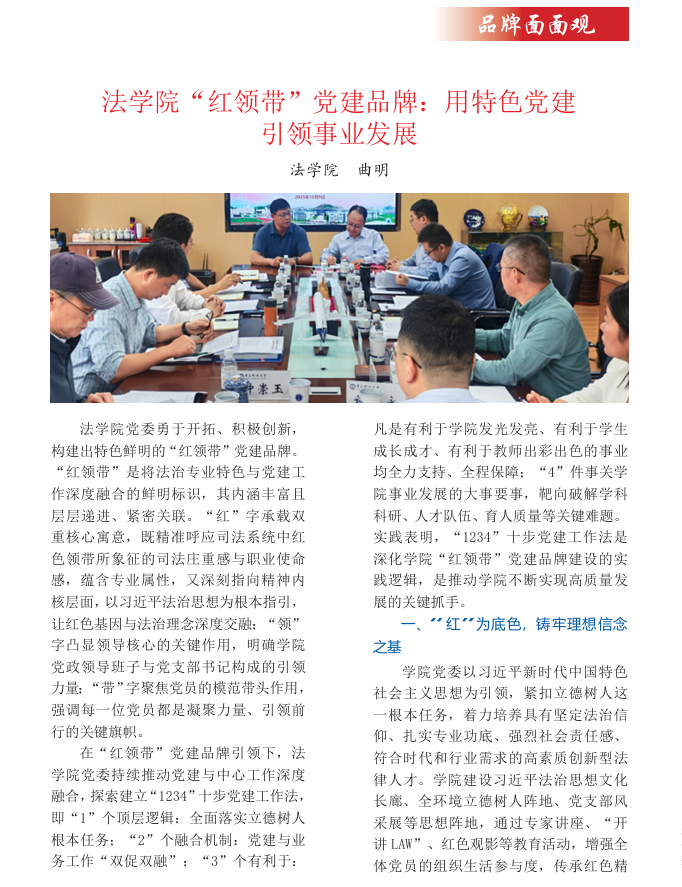 公司党委勇于开拓、积极创新,构建出特色鲜明的“红领带”党建品牌。“红领带”是将法治专业特色与党建工作深度融合的鲜明标识,其内涵丰富且 层层递进、紧密关联。“红”字承载双重核心寓意,既精准呼应司法系统中红色领带所象征的司法庄重感与职业使命感,蕴含专业属性,又深刻指向精神内核层面,以习近平法治思想为根本指引, 让红色基因与法治理念深度交融;“领”字凸显领导核心的关键作用,明确公司 党政领导班子与党支部书记构成的引领 力量;“带”字聚焦党员的模范带头作用,强调每一位党员都是凝聚力量、引领前行的关键旗帜。