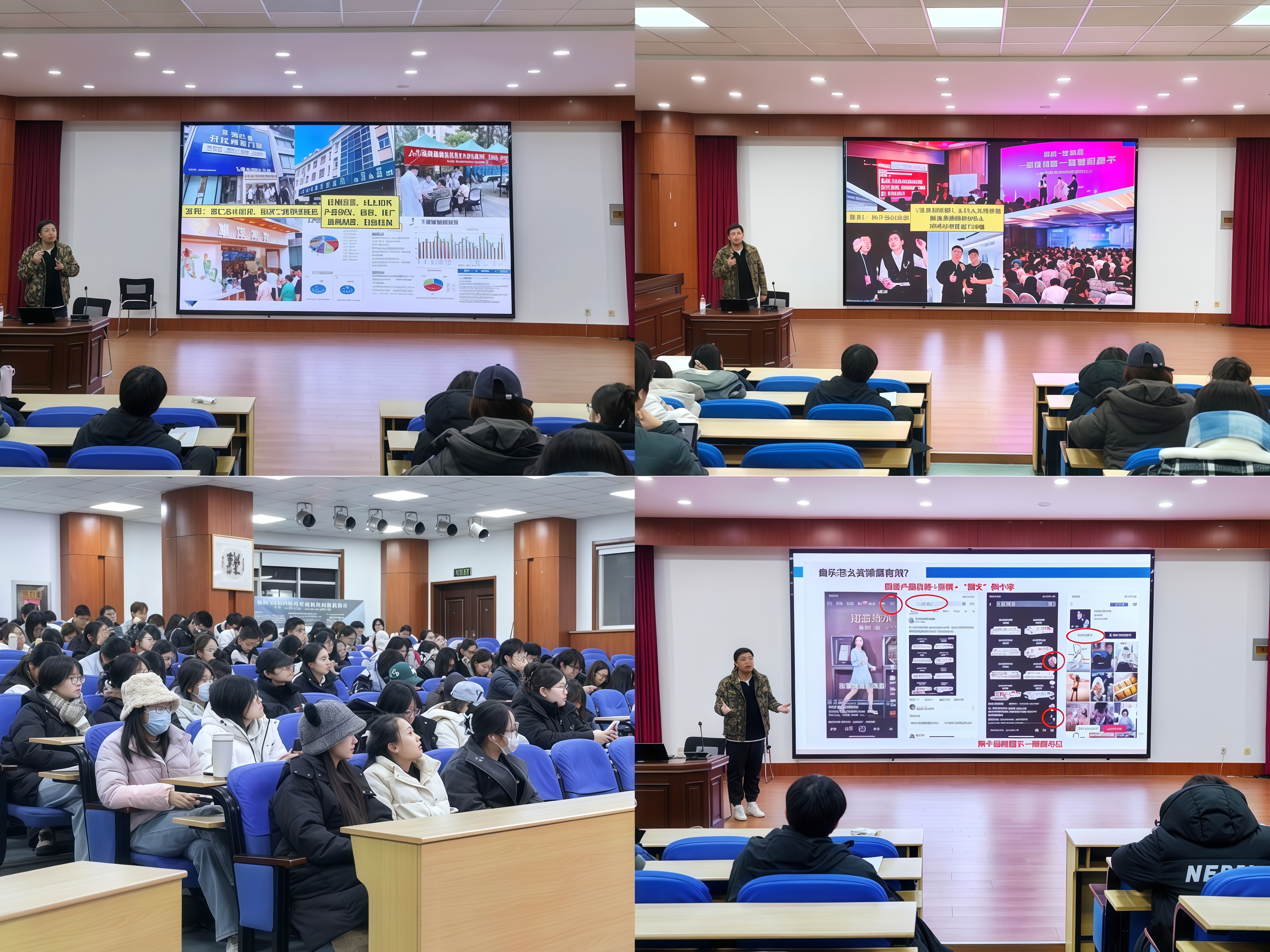 王秉全在新媒体内容策划与品牌推广领域深耕多年,曾主导策划腾讯总部大楼创意展馆等项目,在新媒体与餐饮等行业的融合运营方面积累了丰富经验。在讲座中,他通过“一分钟吃塔可”创意活动助力小众西餐厅迅速走红等生动案例,系统阐述了新媒体内容创作的内在逻辑、策划推广岗位的职能构成、不同平台运营规则以及新账号的冷启动策略等内容。同时,他深入剖析了新媒体与多领域融合带来的新机遇,并就老员工如何在新媒体时代明确自身定位、探索发展方向提出了切实建议,鼓励同学们勇于突破思维局限,积极尝试,以创意和执行力塑造个人或项目的品牌影响力。