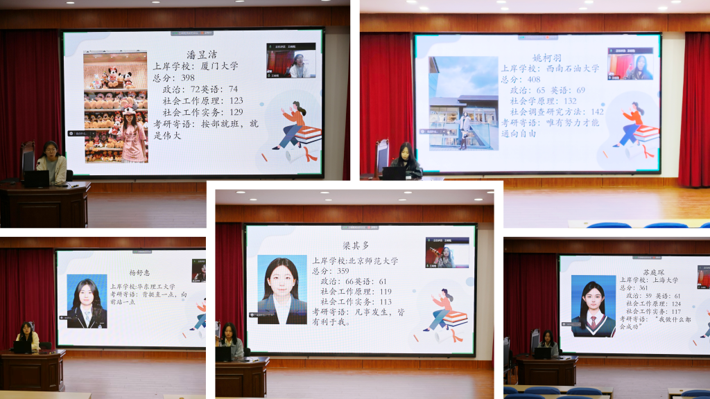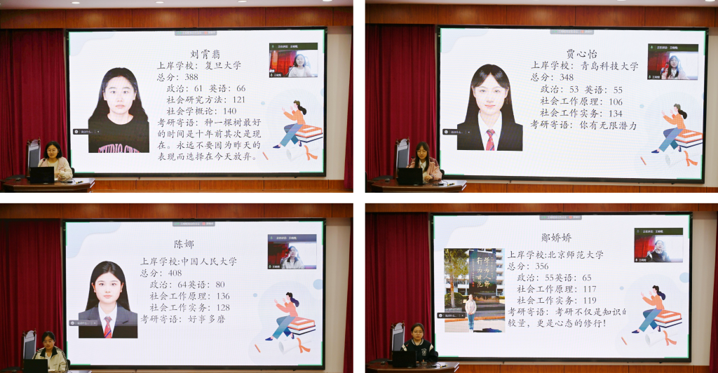 本次分享会由社会工作系教师王卫国、刘琰进行考研指导,并邀请多位考研成功的员工为同学们答疑解惑,提供备考经验。社会工作专业本科各年级同学积极参与,高密校区社会工作专业员工们也通过线上方式参与。