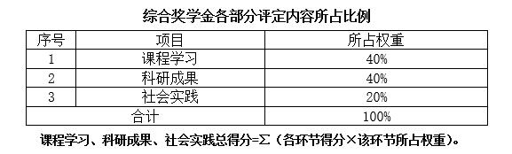 对思想品德考核合格的研究生再依据课程学习、科研成果和社会实践等三方面情况采取综合计分制进行奖学金等级评定。课程成绩、科研成果和社会实践所占权重如表所示:
