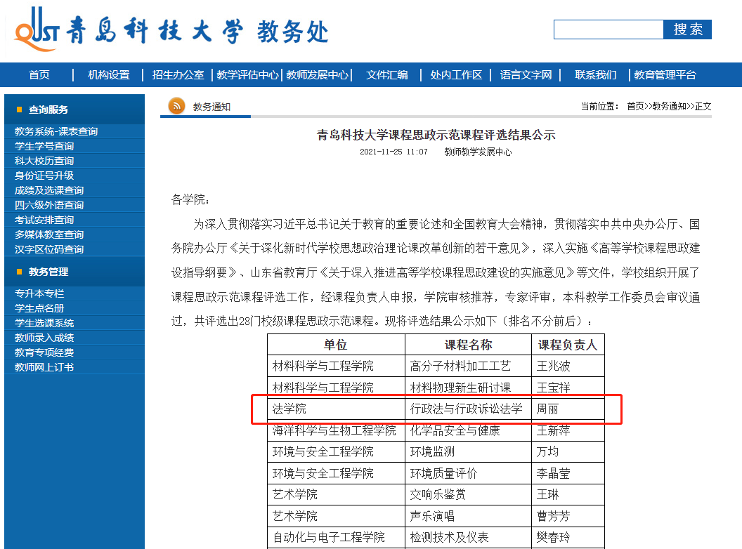 为深入贯彻落实习近平总书记关于教育的重要论述和全国教育大会精神,贯彻落实中共中央办公厅、国务院办公厅《关于深化新时代公司思想政治理论课改革创新的若干意见》,深入实施《高等公司课程思政建设指导纲要》、山东省教育厅《关于深入推进高等公司课程思政建设的实施意见》等文件,近期,公司组织开展了课程思政示范课程评选工作,经课程负责人申报,公司审核推荐,专家评审,本科教学工作委员会审议通过,共评选出28门校级课程思政示范课程。公司周丽老师负责的课程《行政法与行政诉讼法学》获w88win体育官网入口课程思政示范课程。